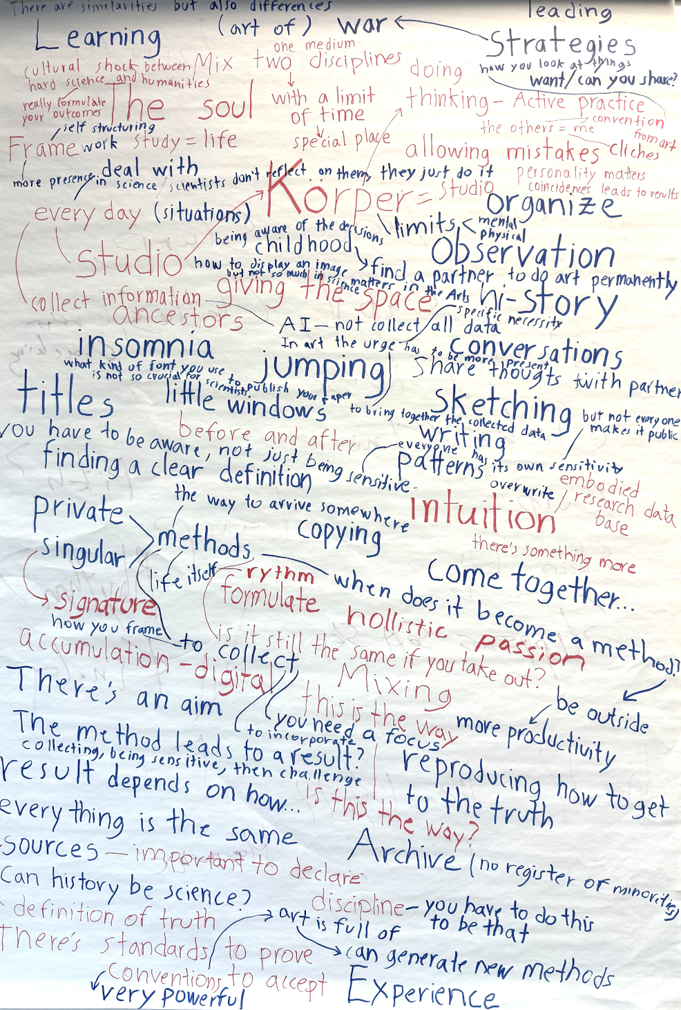 Based on inputs, text readings and the participants' questions and practices, the lab places artistic procedures, processes and approaches in a dialogue with the inherent or related methods of research, experimentation, questioning, investigation and processing in scientific and other knowledge-creating fields in art, in research and in society.