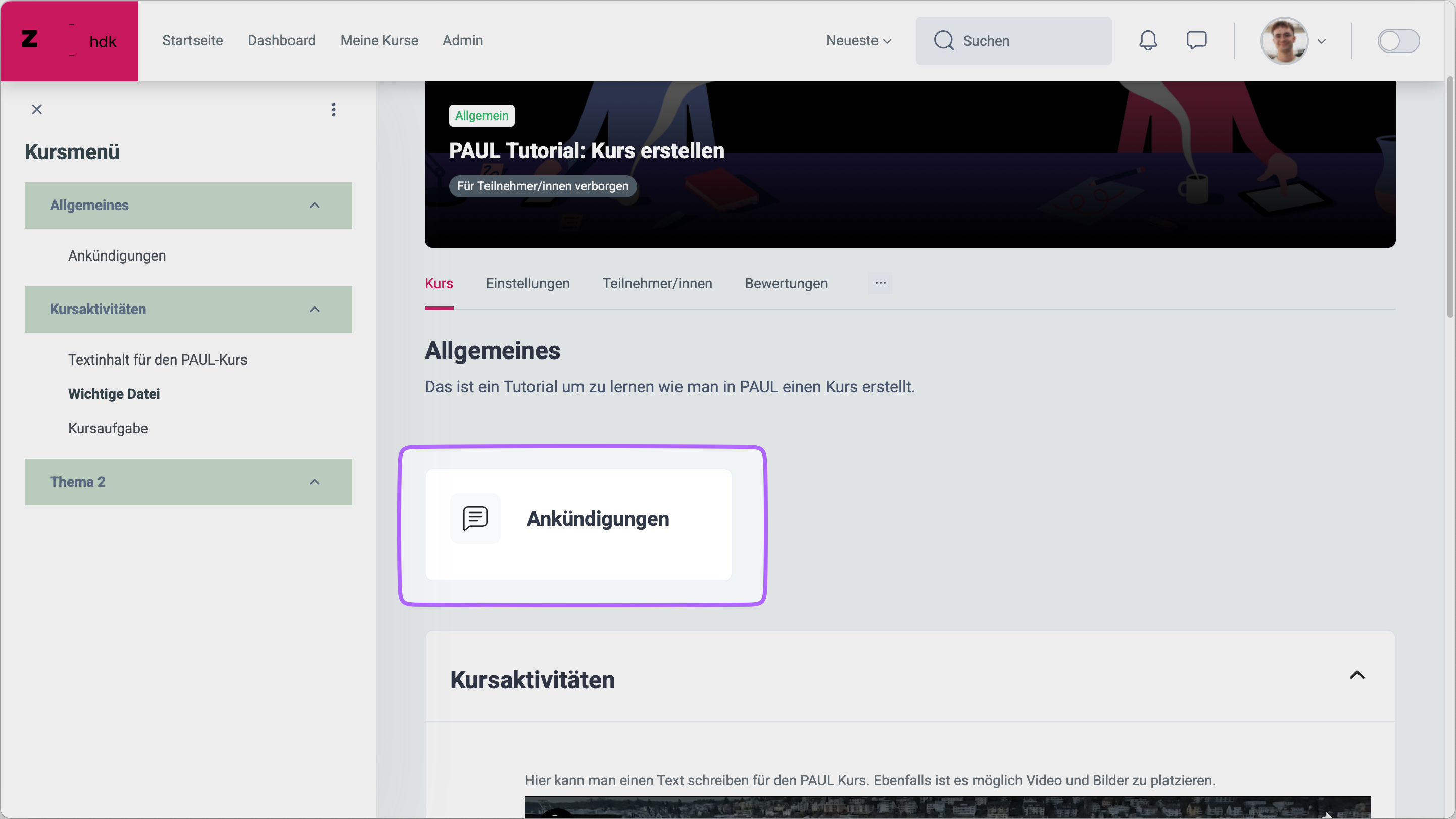 Wenn ein Kurs eröffnet wird, erscheint automatisch das Element «