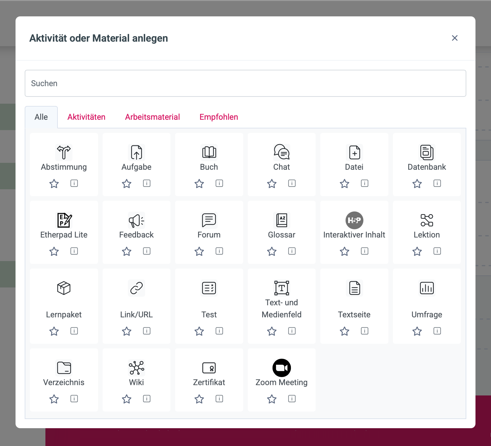 Dann erscheinen im Kurs in den Themen Buttons mit der Aufschrift «Aktivität oder Material anlegen».